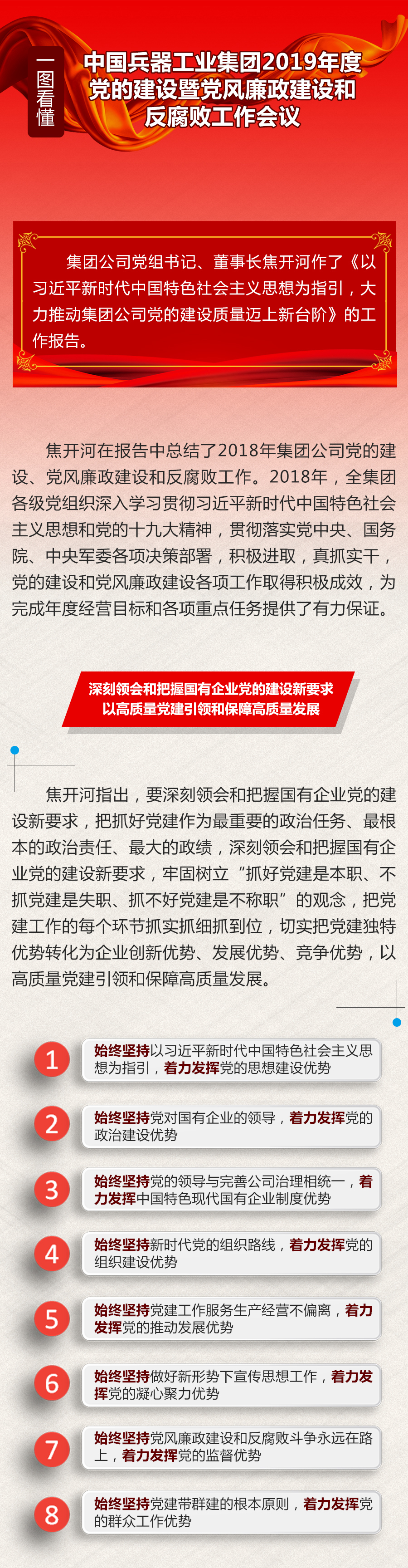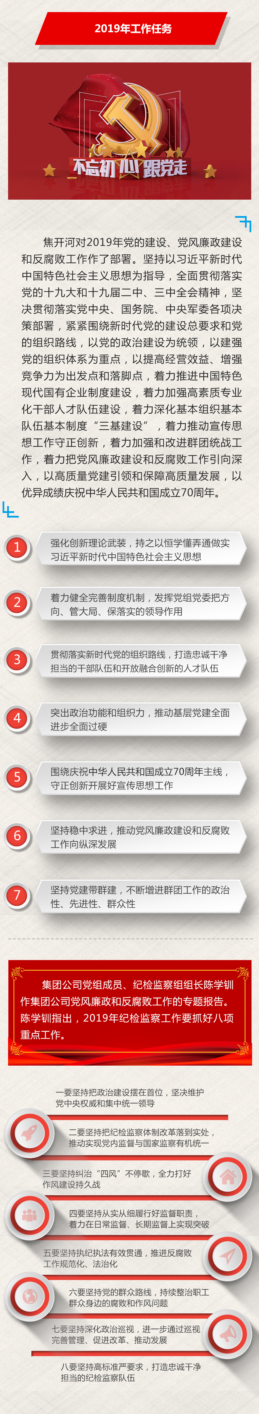 焦開河對2019年黨的建設、黨風廉政建設和反腐敗工作作了部署。2019年集團公司黨建工作總的要求是:以習近平新時代中國特色社會主義思想為指導,全面貫徹落實黨的十九大和十九屆二中、三中全會精神,堅決貫徹落實黨中央、國務院、中央軍委各項決策部署,緊緊圍繞新時代黨的建設總要求和黨的組織路線,以黨的政治建設為統領,以建強黨的組織體系為重點,以提高經營效益、增強競爭力為出發(fā)點和落腳點,著力推進中國特色現代國有企業(yè)制度建設,著力加強高素質專業(yè)化干部人才隊伍建設,著力深化基本組織基本隊伍基本制度“三基建設”,著力推動宣傳思想工作守正創(chuàng)新,著力加強和改進群團統戰(zhàn)工作,著力把黨風廉政建設和反腐敗工作引向深入,以高質量黨建引領和保障高質量發(fā)展,以優(yōu)異成績向新中國成立70周年獻禮。一是強化創(chuàng)新理論武裝,持之以恒學懂弄通做實習近平新時代中國特色社會主義思想。二是著力健全完善制度機制,發(fā)揮黨組(黨委)把方向、管大局、保落實的領導作用。三是貫徹落實新時代黨的組織路線,打造忠誠干凈擔當的干部隊伍和開放融合創(chuàng)新的人才隊伍。四是突出政治功能和組織力,推動基層黨建全面進步全面過硬。五是圍繞慶祝新中國成立70周年主線,守正創(chuàng)新開展好宣傳思想工作。六是堅持穩(wěn)中求進,推動黨風廉政建設和反腐敗工作向縱深發(fā)展。七是堅持黨建帶群建,不斷增進群團工作的政治性、先進性、群眾性。