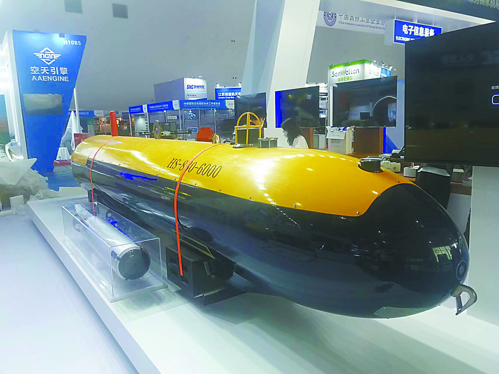相比公眾相對熟悉的無人機和無人車,無人船和無人潛航器的知名度略低,但本屆珠海航展上展出的相關(guān)裝備具備相當(dāng)高的水平。例如HS-880-6000型自主式水下航行器(AUV)就是國內(nèi)首型搜救型無人潛航器。它的最大工作深度達(dá)6000米,能以3節(jié)的速度連續(xù)航行24小時,配備有深水遇險目標(biāo)高分辨低照度照明系統(tǒng)、聲信標(biāo)定向引導(dǎo)聲吶、水聲探測側(cè)掃聲吶等,具備工作水深范圍寬、載荷能力大、續(xù)航力長、搜尋探測能力強等特點,可對深海目標(biāo)全自主精細(xì)搜尋、探測、定位,執(zhí)行深海水下目標(biāo)搜尋探測和海洋科學(xué)研究任務(wù)。另一款“守望者”無人潛航器個頭小巧,配備有光學(xué)探頭、戰(zhàn)斗部和通信設(shè)備,可以自動靠近水中或海底目標(biāo)進(jìn)行觀測、毀傷目標(biāo),用于執(zhí)行反水雷、排障、海底管道巡檢等任務(wù)。