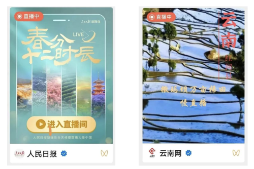 3月20日為農(nóng)歷二十四節(jié)氣的春分,在中國兵器工業(yè)集團(tuán)有限公司的助力下,人民日報(bào)、云南網(wǎng)等主流媒體再次聚焦紅河縣撒瑪壩萬畝梯田,人民日報(bào)新媒體平臺(tái)策劃推出“春分十二時(shí)辰”直播活動(dòng),通過鏡頭展示祖國各地春分時(shí)節(jié)壯美的自然風(fēng)光。其中,人民日報(bào)視頻號(hào)和云南網(wǎng)視頻號(hào)在中午時(shí)段的直播中,紅河縣撒瑪壩萬畝梯田出現(xiàn)在觀眾的視野里,贏得了數(shù)十萬觀眾的點(diǎn)贊,產(chǎn)生了良好的社會(huì)效應(yīng)。