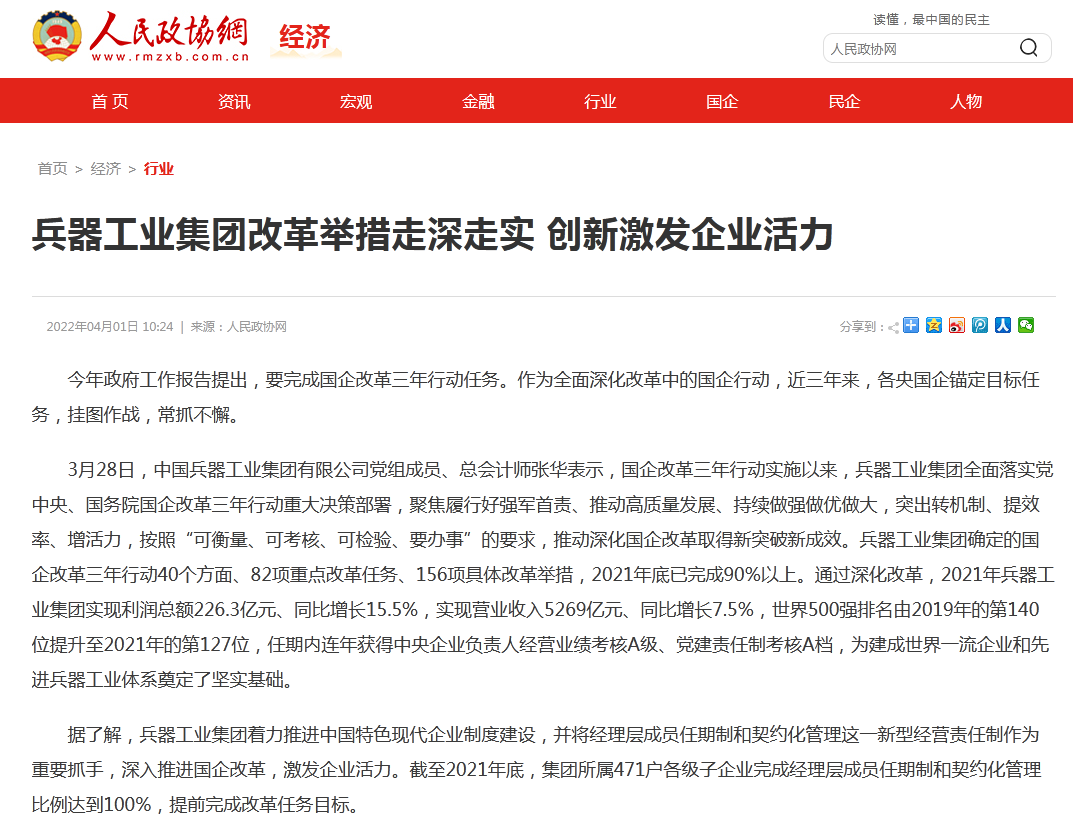 人民政協(xié)網(wǎng):兵器工業(yè)集團(tuán)改革舉措走深走實(shí) 創(chuàng)新激發(fā)企業(yè)活力