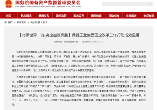 國(guó)資委網(wǎng)站:【對(duì)標(biāo)世界一流 央企加速奔跑】兵器工業(yè)集團(tuán)國(guó)企改革三年行動(dòng)成效顯著