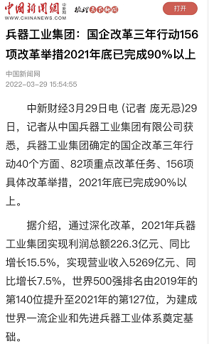 中國(guó)新聞社:兵器工業(yè)集團(tuán):國(guó)企改革三年行動(dòng)156項(xiàng)改革舉措2021年底已完成90%以上
