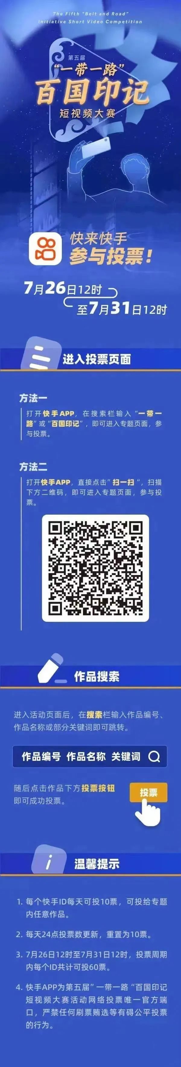 7月26日,由外交部新聞司、中央網(wǎng)信辦網(wǎng)絡傳播局指導,中國公共外交協(xié)會、國務院國資委新聞中心、環(huán)球網(wǎng)聯(lián)合主辦的第五屆“一帶一路”百國印記短視頻大賽完成作品征集,正式開啟投票階段。