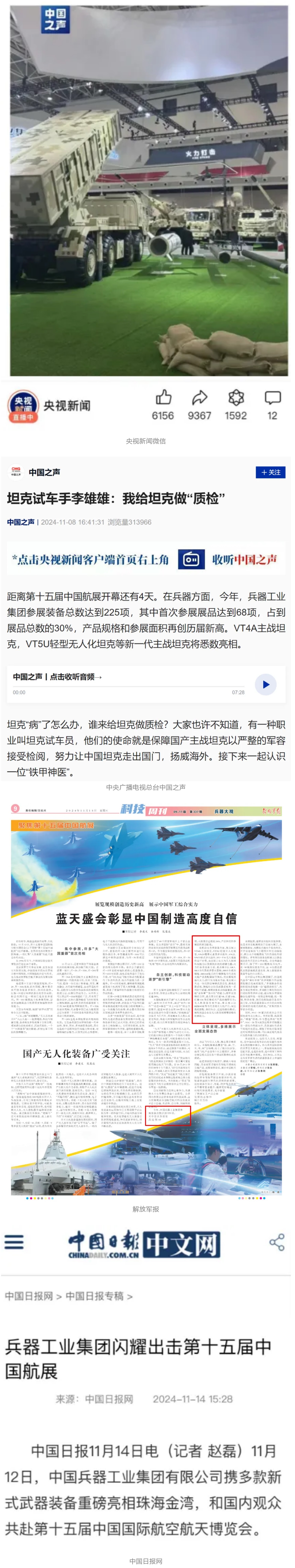 11月12日至17日,第十五屆中國國際航空航天博覽會在廣東省珠海市舉行,中國兵器工業(yè)集團有限公司突出數(shù)智賦能軍貿(mào)合成旅作戰(zhàn)體系,帶來了一系列新產(chǎn)品、新技術(shù)、新體系,全方位展示我國陸軍外貿(mào)武器裝備發(fā)展最高水平、最新突破、最前沿成果,立體化呈現(xiàn)陸域信息化、智能化、體系化作戰(zhàn)能力,受到了全社會廣泛關注。航展期間,央視綜合頻道《新聞聯(lián)播》、央視新聞頻道《新聞直播間》《長空鵬程》報道兵器工業(yè)集團參展情況,重點介紹了VT4A1主戰(zhàn)坦克、輪式裝甲火炮、新一代陸域指控信息系統(tǒng)、無人戰(zhàn)車、民用無人運輸機及地面裝備演示有關內(nèi)容。央視新聞推出航展直播節(jié)目《藍天之約》,邀請兵器工業(yè)集團嘉賓對參展情況、裝備動態(tài)演示作了講解。
