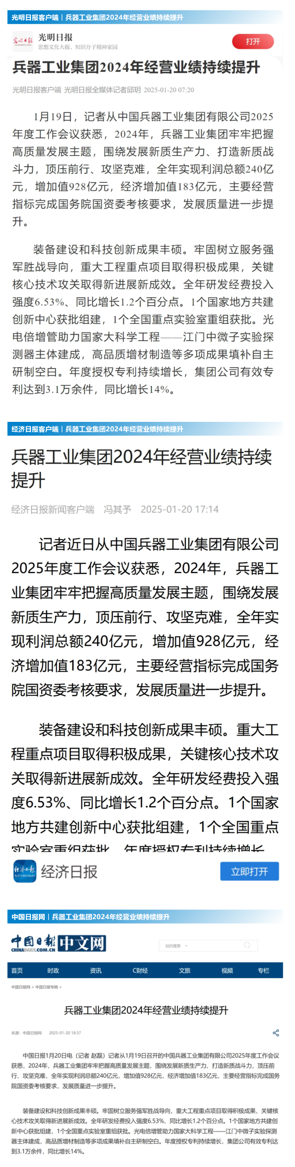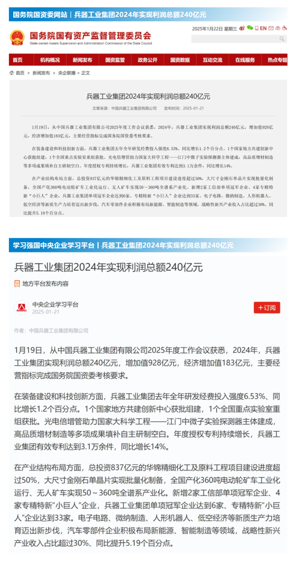 中國新聞網(wǎng):兵器工業(yè)集團(tuán)2024年實(shí)現(xiàn)利潤總額240億元2025-01-20