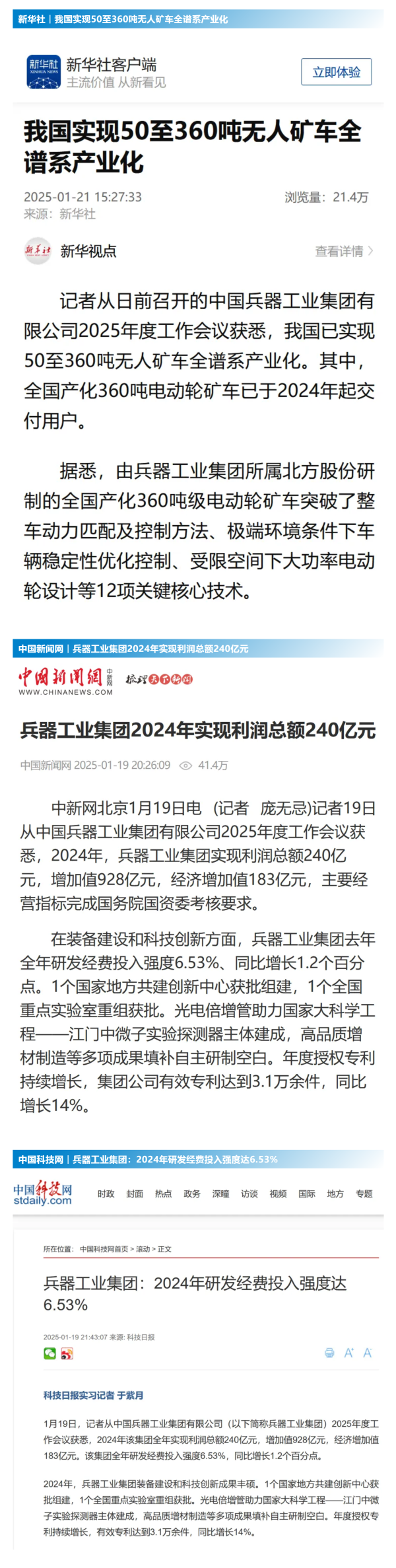 集團(tuán)公司2024年取得的成績及下一步重點(diǎn)工作受到社會媒體廣泛關(guān)注。新華社、中國新聞網(wǎng)、中國科技網(wǎng)、光明日報(bào)客戶端、經(jīng)濟(jì)日報(bào)客戶端、中國日報(bào)網(wǎng)、國務(wù)院國資委網(wǎng)站、學(xué)習(xí)強(qiáng)國中央企業(yè)學(xué)習(xí)平臺、新浪網(wǎng)、網(wǎng)易網(wǎng)、搜狐網(wǎng)、騰訊網(wǎng)、鳳凰網(wǎng)等中央主流媒體、國家部委網(wǎng)站及知名網(wǎng)絡(luò)媒體對集團(tuán)公司2025年度工作會議進(jìn)行了報(bào)道,重點(diǎn)關(guān)注集團(tuán)公司經(jīng)營業(yè)績、科技創(chuàng)新、產(chǎn)業(yè)結(jié)構(gòu)布局優(yōu)化等情況。其中,新華社以《我國實(shí)現(xiàn)50至360噸無人礦車全譜系產(chǎn)業(yè)化》為題,重點(diǎn)報(bào)道了集團(tuán)公司在推動智能制造水平提升方面取得的成效;中國新聞網(wǎng)、光明日報(bào)客戶端、經(jīng)濟(jì)日報(bào)客戶端、中國日報(bào)網(wǎng)等就集團(tuán)公司2024年度經(jīng)營業(yè)績及各項(xiàng)工作取得的成果進(jìn)行報(bào)道;中國科技網(wǎng)著重報(bào)道了集團(tuán)公司在科技創(chuàng)新和優(yōu)化產(chǎn)業(yè)結(jié)構(gòu)布局方面的最新進(jìn)展。集團(tuán)公司門戶網(wǎng)站、微信公眾號、微博等新媒體平臺以及《中國兵工報(bào)》也對集團(tuán)公司工作會議進(jìn)行了及時(shí)報(bào)道,各成員單位紛紛對相關(guān)內(nèi)容進(jìn)行轉(zhuǎn)載,引發(fā)全系統(tǒng)關(guān)注。