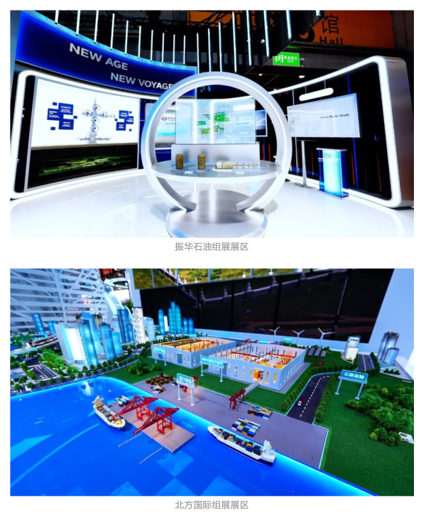振華石油以“一滴油的故事”串聯起從勘探開采到貿易服務的全產業(yè)鏈,揭示油氣勘探的地球密碼。北方礦業(yè)以《千里江山圖》為靈感,將綠色發(fā)展理念融入礦業(yè)開發(fā),呈現“綠水青山就是金山銀山”的現代礦業(yè)新圖景。北方國際通過創(chuàng)新性的5D穹幕電影、UI互動屏幕、2.5D墻上沙盤等手段,帶領觀眾全景感知電力、礦產、交通等領域一體化建設的豐碩成果。奧信公司以一體化服務模型,凸顯全流程自主可控的核心優(yōu)勢。